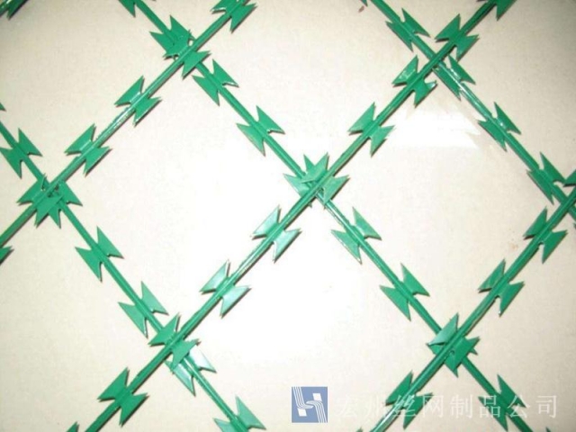 浸塑刀片刺網特點:浸塑刀片刺網浸塑后的顏色有多種:白色、藍色、草綠、墨綠、黑色等十幾種顏色,浸塑后的刀片刺網防腐系能更佳好、顏色鮮亮、美觀大方。