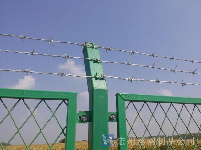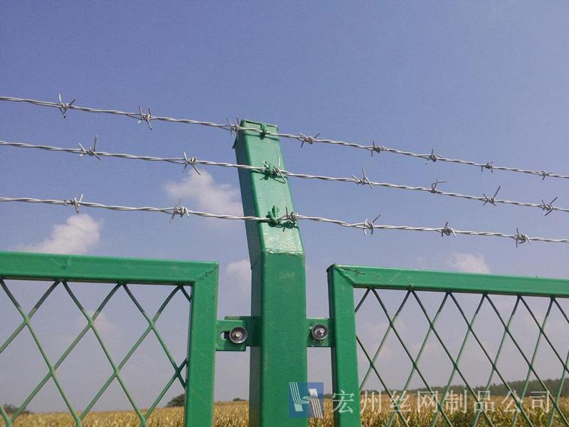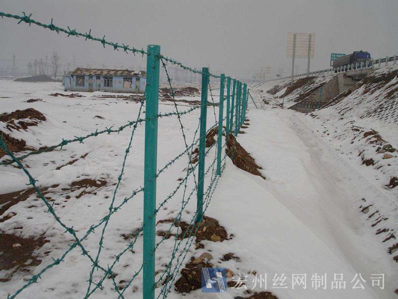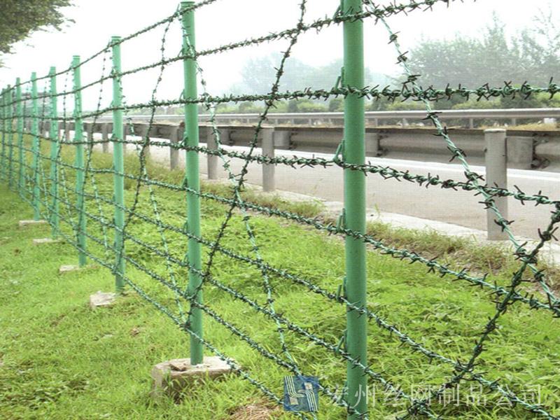 刺繩隔離網,刺絲護欄網,刺鐵絲隔離柵,刺繩護欄網,鍍鋅刺網。宏州護欄網廠生產的產品主要分鍍鋅,浸塑兩種,是以立柱加刺繩制作而成, 刺繩刺鐵絲。